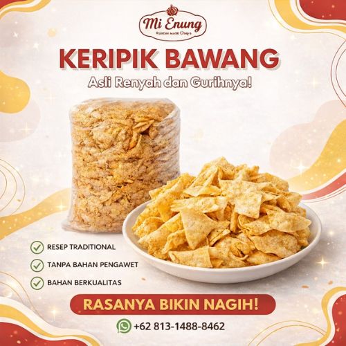 Dapur Mi Enung menyediakan aneka camilan gurih seperti kripik bawang dan akar kelapa yang renyah dan lezat. Cocok untuk berbagai acara seperti acara kantor, rapat, ulang tahun, arisan, syukuran, dan berbagai momen spesial lainnya. Dibuat dari bahan pilihan, diolah secara higienis, dengan rasa autentik yang disukai semua kalangan.